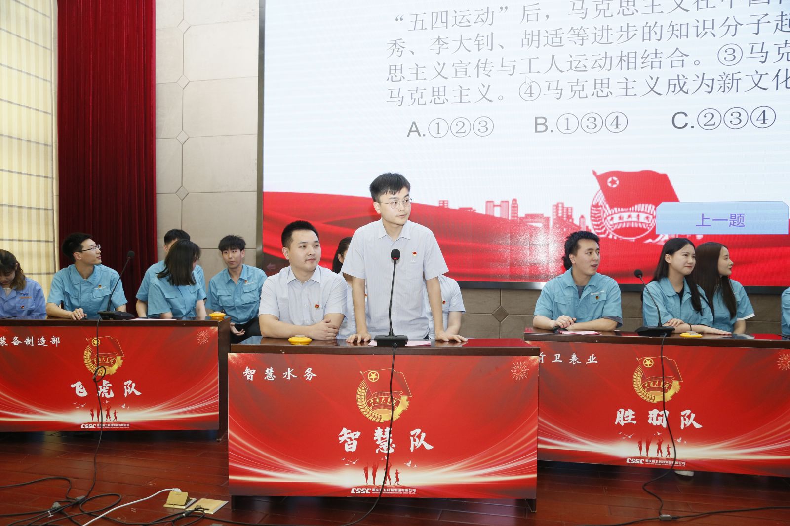 表彰會后,慶祝建團百年知識競賽火熱展開。來自各基層團組織的8支隊伍同場競技。最終,前衛(wèi)無線&工程事業(yè)部(聯(lián)隊)獲得一等獎,技術(shù)中心、職能部門獲得二等獎,前衛(wèi)表業(yè)、智慧水務、科凱前衛(wèi)獲得三等獎。